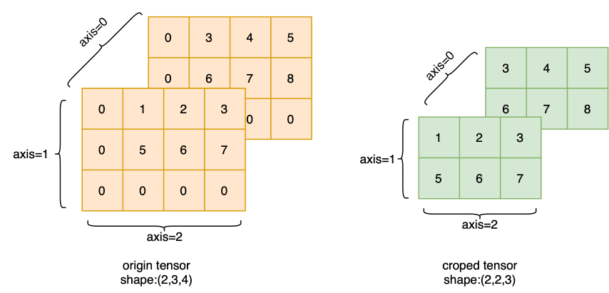 offsets (list|tuple|Tensor,可选) - 每个维度上裁剪的偏移量,数据类型为 int32。如果是列表或元组,则其长度必须与 x 的维度大小相同,如果是 Tensor,则其应是 1-D Tensor。当它是列表时,每一个元素可以是整数或者形状为[]的 0-D Tensor。含有 Tensor 的方式适用于每次迭代的偏移量(offset)都可能改变的情况。默认值:None,每个维度的偏移量为 0。