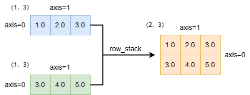 下图展示了一个 row_stack 的情形,将一个形状为(1,3)的二维张量与另一个同样形状为(1,3),但是数据内容不同的二维张量进行 row_stack 操作,二者沿垂直轴堆叠成一个新的二维向量。通过图例能很好看出张量的变化。