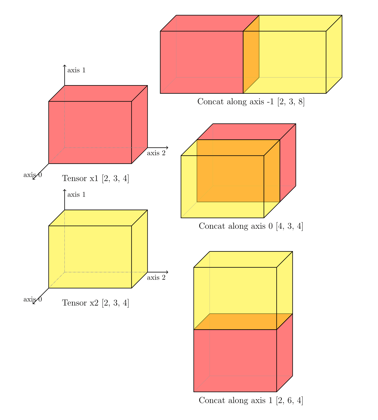 下图展示了 concat 操作的典型情况——两个形状为 [2, 3, 4] 的三维张量通过 concat 操作沿着不同的 axis 轴拼接为不同形状的三维张量,我们可以清晰地看到不同维度拼接的效果。
