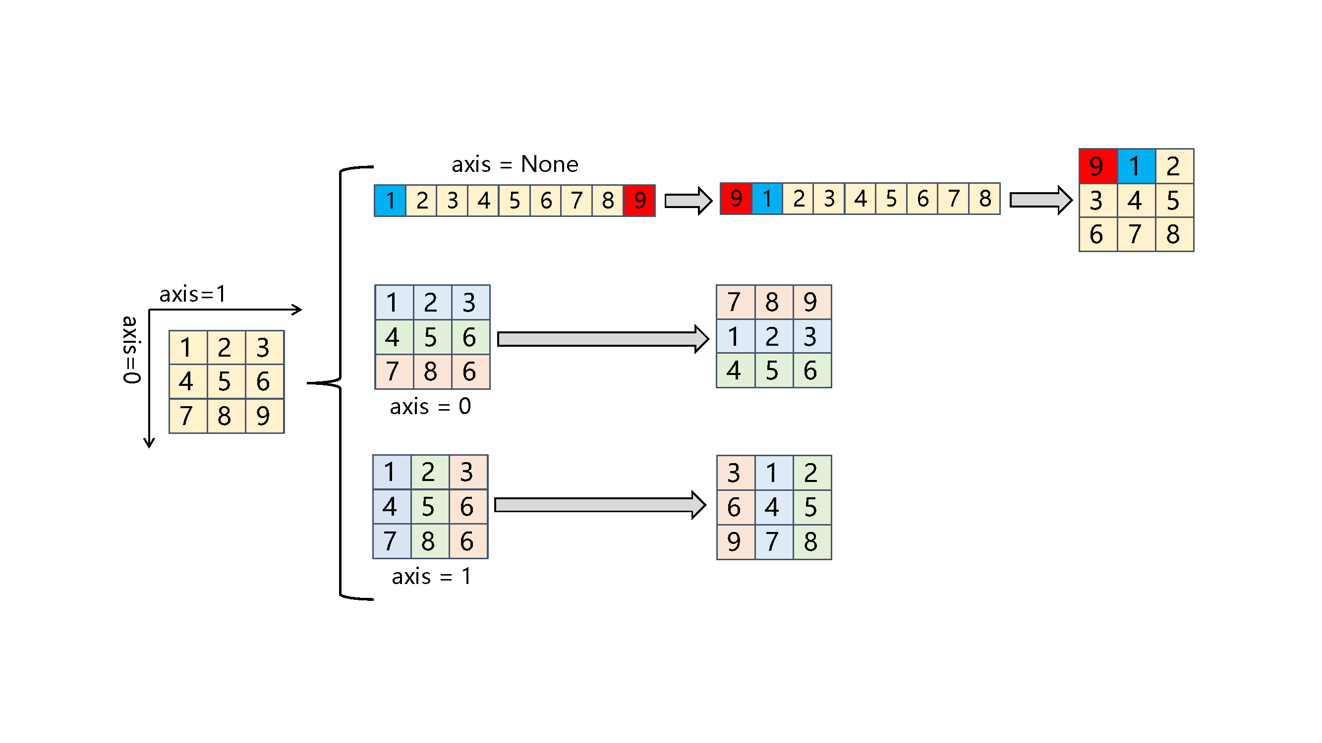 由于 axis 参数的取值不同,对应的滚动操作也不同,由图可以看到每个元素在不同滚动操作下的位置变化。