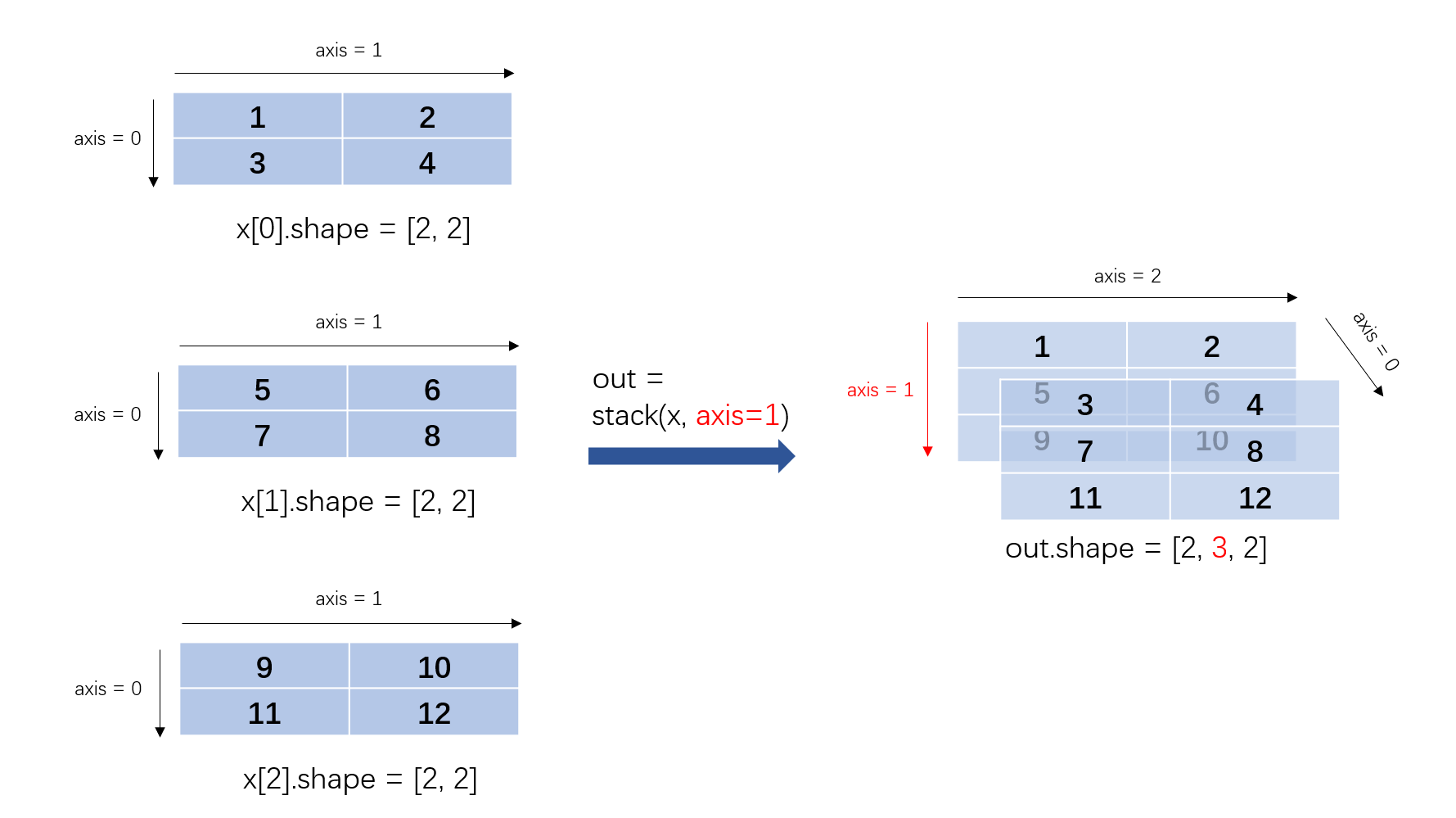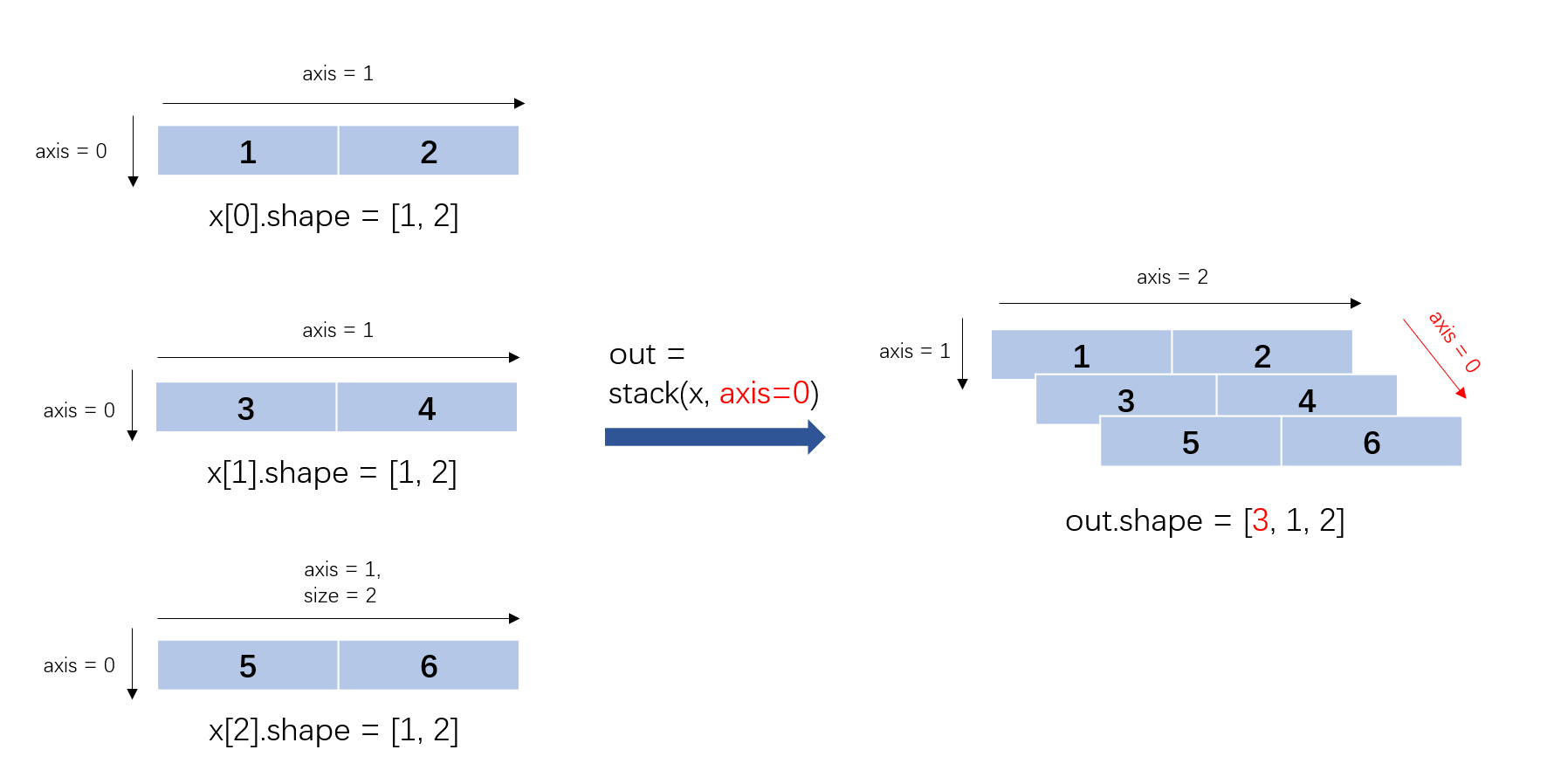 沿 axis 轴对输入 x 进行堆叠操作。要求所有输入 Tensor 有相同的 Shape 和数据类型。 例如,输入 x 为 N 个 Shape 为 [A, B]的 Tensor,如果 axis==0,则输出 Tensor 的 Shape 为 [N, A, B];如果 axis==1,则输出 Tensor 的 Shape 为 [A, N, B];以此类推。